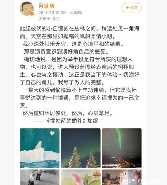 其实还没完全放下呢,早年跟陈建斌那段感情,背后还有一番道理,也给那些大龄未婚女明星敲了个警钟。生活情况最近,吴越在社交媒体上发了一组文艺范儿的照片,里面没有她的身影。在黑暗中有闪烁的极光,极光下是灯火通明的村庄,还有一幅黑白色的画,画里有人双手举在空中,底下是条马路。